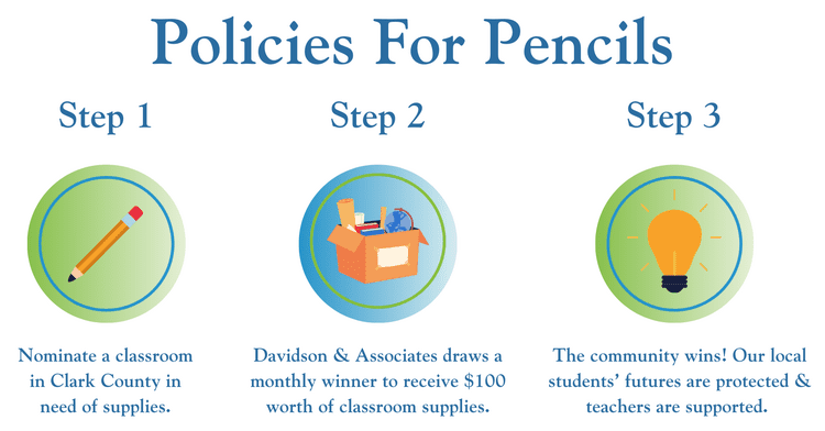 As an independent agency deeply rooted in the Clark County area, Davidson Insurance recognizes the significant out-of-pocket expenses teachers often face to keep their classrooms running. “Policies for Pencils” was created to bridge that gap and celebrate the hard work of local educators. Beyond selling insurance that helps protect homes, cars and businesses, we are investing in the students and educators who represent the true future of our community