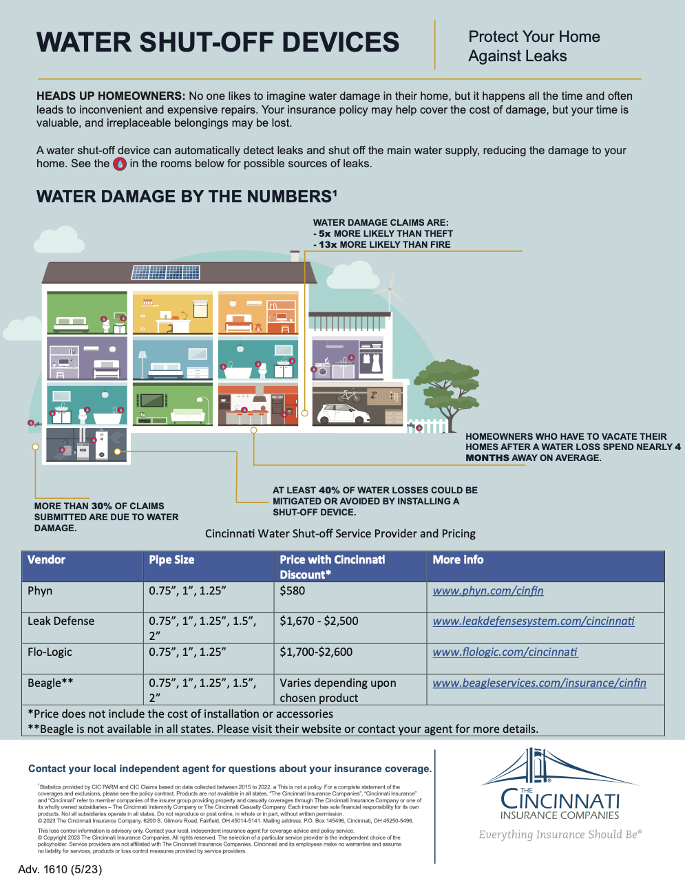 Many water losses can be prevented or mitigated by an automatic water shut-off device. This device constantly monitors water flow through your home’s pressurized plumbing system and automatically shuts off the water if a leak is detected, preventing further damage. Cincinnati works with vendors such as Beagle Services, Flologic, Leak Defense and Phyn, to offer policyholders preferred pricing for water shut-off devices. Learn more at the link below and check with your independent agent for eligibility.